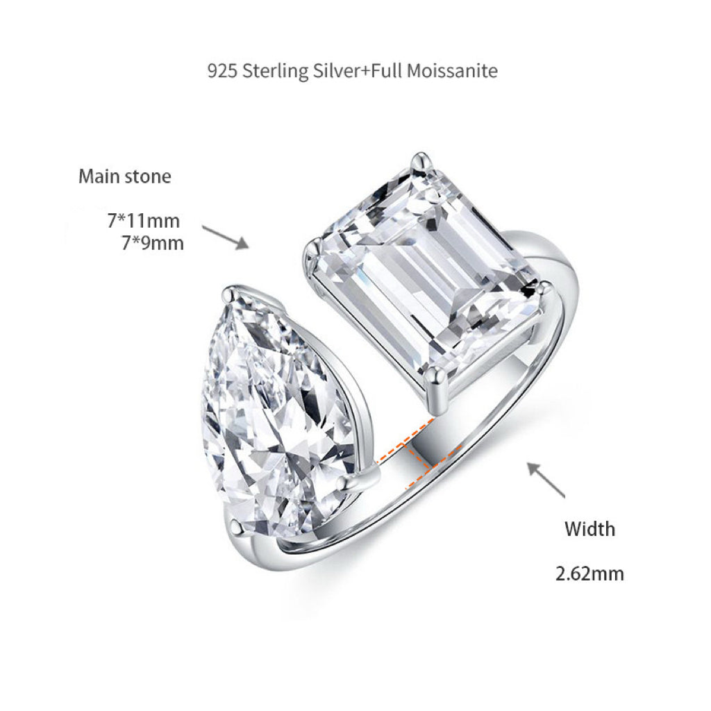 [PRE-ORDER] Shine & Co. Pear & Emerald Cut Ring – A captivating union of two exquisite cuts, this ring showcases a 3-carat pear-cut moissanite and a 3-carat emerald-cut moissanite, perfectly balanced in one elegant design. The contrasting silhouettes highlight brilliance and depth, creating a refined piece that stands out from every angle. Crafted in 925 sterling silver, it’s a bold yet timeless expression of luxury.